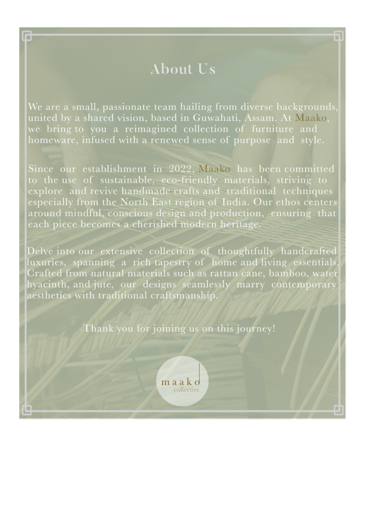 At Maako, we bring to you a reimagined collection of furniture and homeware infused with a renewed sense of purpose and style. We produce furniture and handicrafts made out of natural materials such as rattan cane, bamboo, water hyacinth and jute. We pledge by sustainable and environment-friendly materials and attempt to revive traditional techniques, specially form the Northeast region of India. We believe in mindful, conscious design and production of each and every piece that will become a living modern heritage.